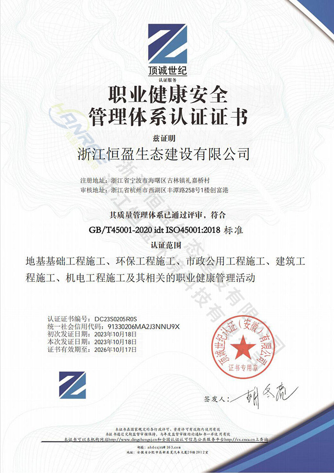 浙江恒盈生態建設有限公司是寧波市環保產業協會會員單位,已取得環保工程專業承包、市政公用工程施工總承包、機電工程施工總承包等多項資質、并已通過了ISO45001、ISO24001、ISO19001多項體系認證。